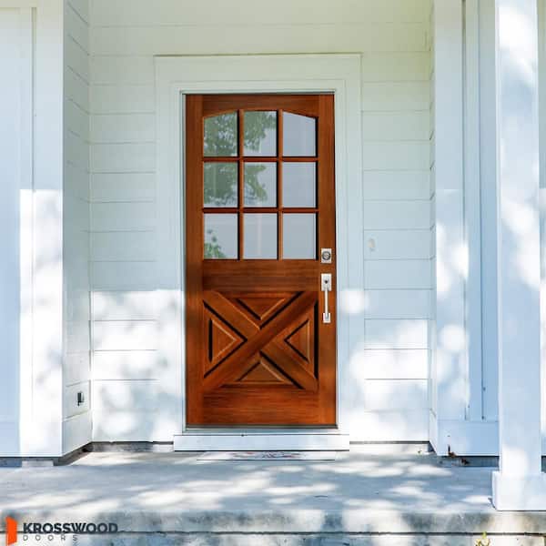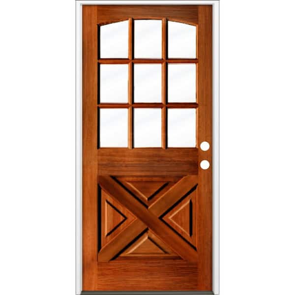 36 in. x 80 in. Farmhouse X Panel LH 1/2 Lite Clear Glass Red Chestnut Stain Hemlock Prehung Front Door