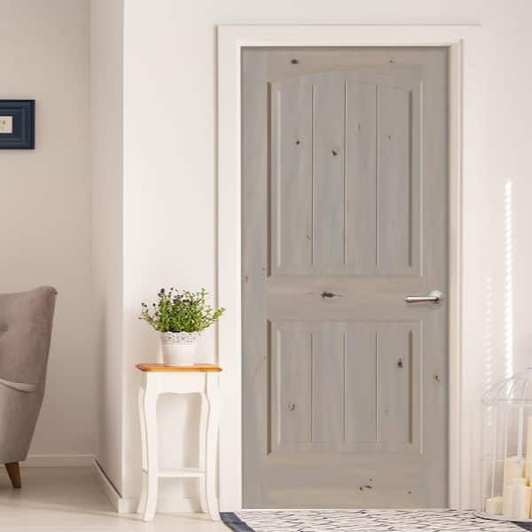 36 in. x 80 in. Knotty Alder 2 Panel Left-Hand Arch V-Groove Red Mahogany Stain Solid Wood Single Prehung Interior Door