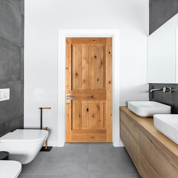 36 in. x 80 in. Knotty Alder 2 Panel Square Top V-Groove Solid Wood Right-Hand Single Prehung Interior Door