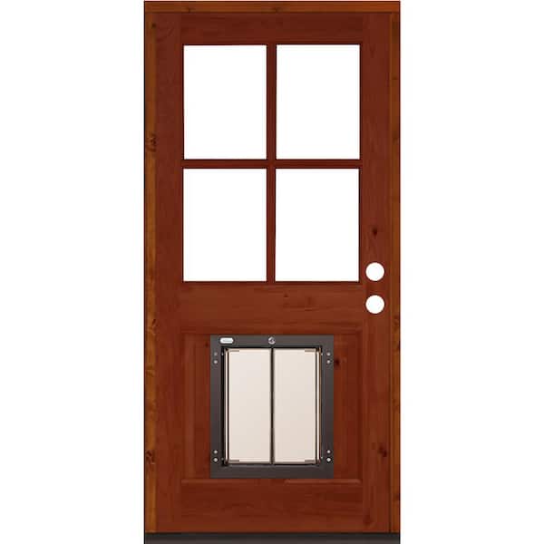 36 in. x 80 in. Left-Hand 4 Lite Clear Glass Red Chestnut Stained Wood Prehung Door with Large Dog Door