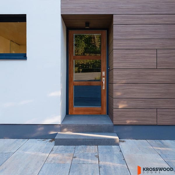 36 in. x 80 in. Modern Hemlock Left-Hand/Inswing 3-Lite Clear Glass Red Chestnut Stain Wood Prehung Front Door