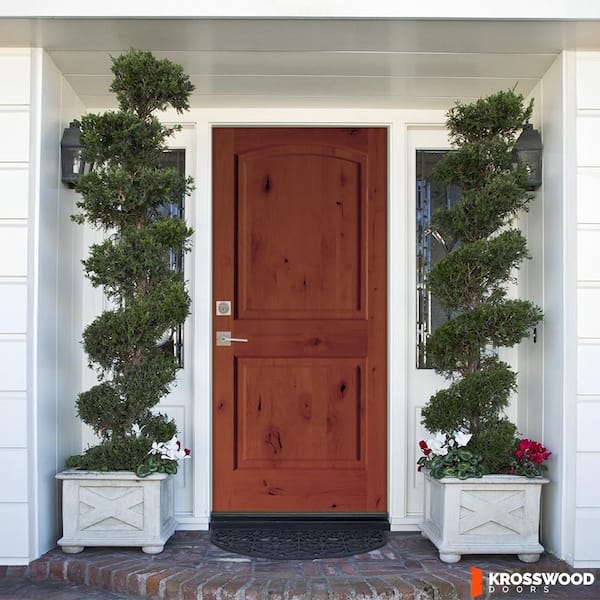 36 in. x 80 in. Rustic Knotty Alder 2-Panel Arch Top Right-Hand/Inswing BEHR Amaretto Stain Wood Prehung Front Door