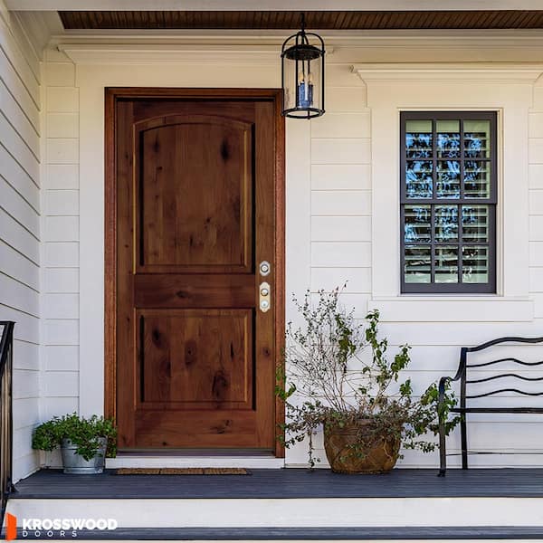 36 in. x 80 in. Rustic Knotty Alder Arch Top Red Chestnut Stain Left-Hand Inswing Wood Single Prehung Front Door