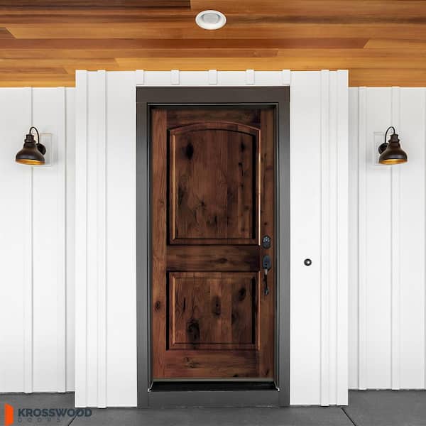 36 in. x 80 in. Rustic Knotty Alder Arch Top Red Mahogany Stain Left-Hand Inswing Wood Single Prehung Front Door