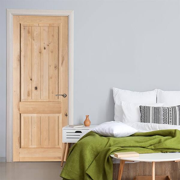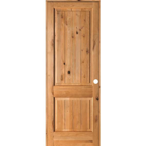 36 in. x 96 in. Knotty Alder 2 Panel Left-Hand Square Top V-Groove Clear Stain Solid Wood Single Prehung Interior Door