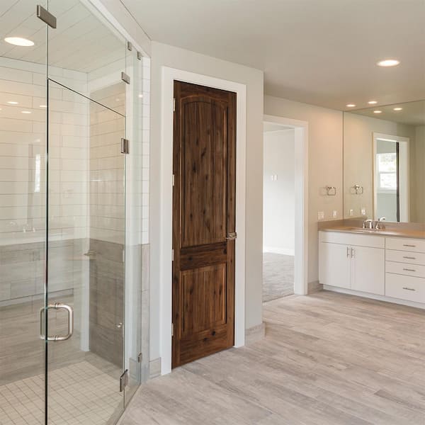 36 in. x 96 in. Knotty Alder 2-Panel Right-Hand Top Rail Arch V-Groove Black Stain Wood Single Prehung Interior Door