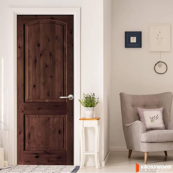 36 in. x 96 in. Rustic 2-Panel Arch Top Left-Hand Red Mahogany Stain Knotty Alder Wood Single Prehung Interior Door