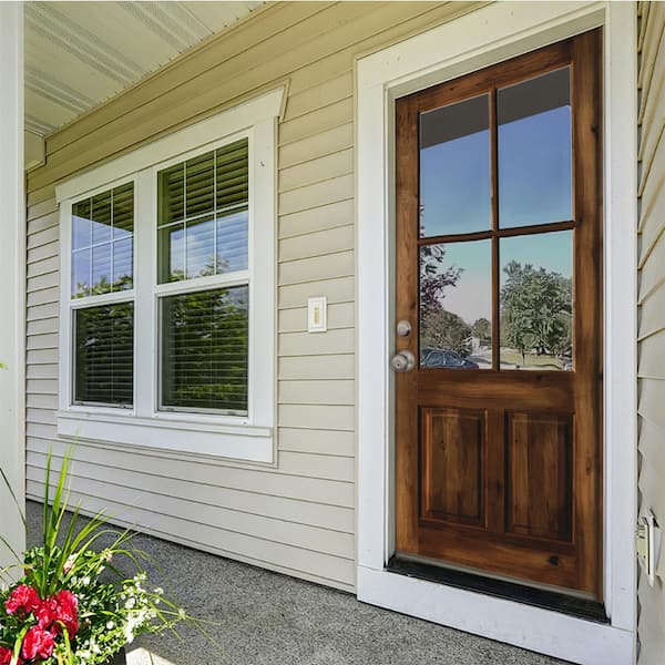42 in. x 96 in. Knotty Alder Right Hand 4-Lite Clear Glass Red Mahogany Stain Wood Prehung Front Door