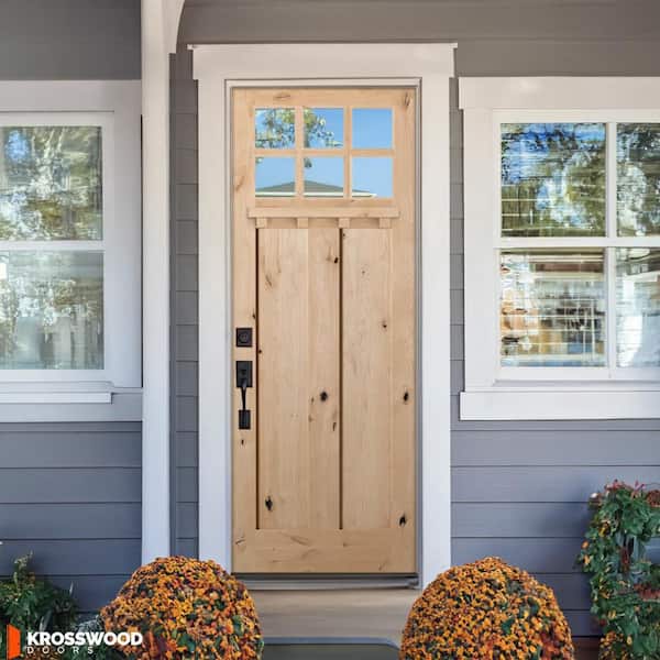 • Knotted wood and glass window front door prehung and stainable