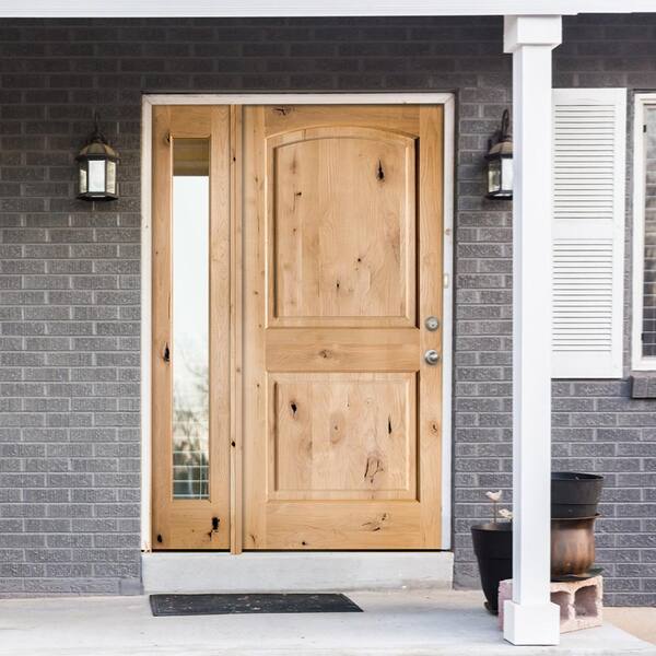 44 in. x 80 in. Rustic Unfinished Knotty Alder Arch-Top Left-Hand Left Full Sidelite Clear Glass Prehung Front Door