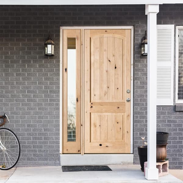 44 in. x 96 in. Rustic Unfinished Knotty Alder Arch Top VG Left-Hand Left Full Sidelite Clear Glass Prehung Front Door