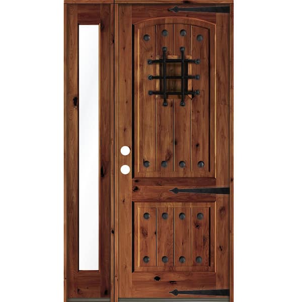46 in. x 96 in. Mediterranean Knotty Alder Right-Hand/Inswing Clear Glass Red Chestnut Stain Wood Prehung Front Door