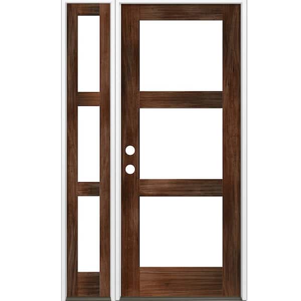 46 in. x 96 in. Modern Hemlock Right-Hand/Inswing 3-Lite Clear Glass Red Mahogany Stain Wood Prehung Front Door with LSL