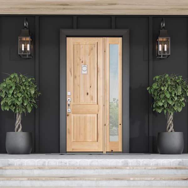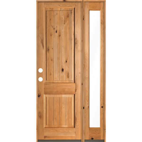 46 in. x 96 in. Rustic Knotty Alder Square Top Right-Hand/Inswing Glass Clear Stain Wood Prehung Front Door with RFSL