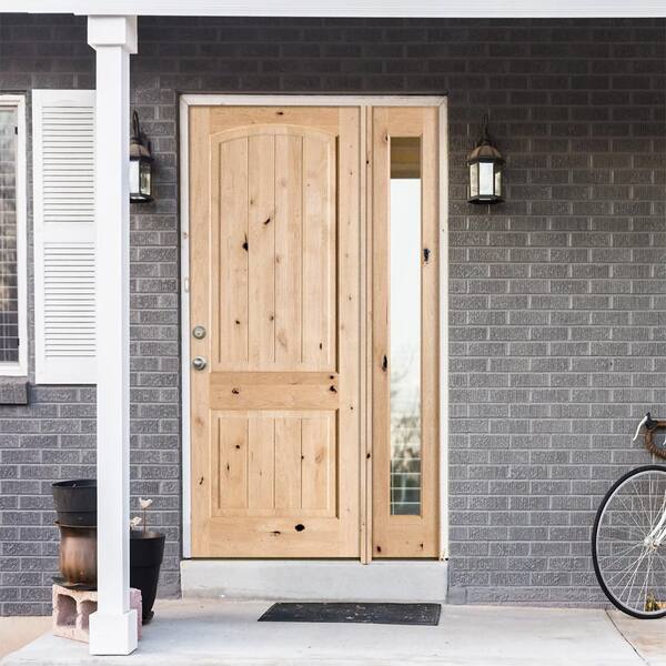 46 in. x 96 in. Rustic knotty alder Right-Hand/Inswing Clear Glass Provincial Stain Wood Prehung Front Door with RFSL