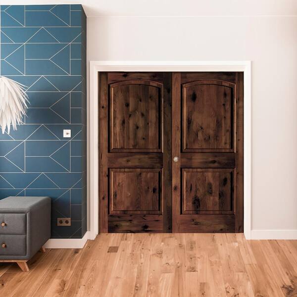 48 in. x 80 in. Knotty Alder 2 Panel Right-Handed Red Mahogany Stain Wood Double Prehung Interior Door