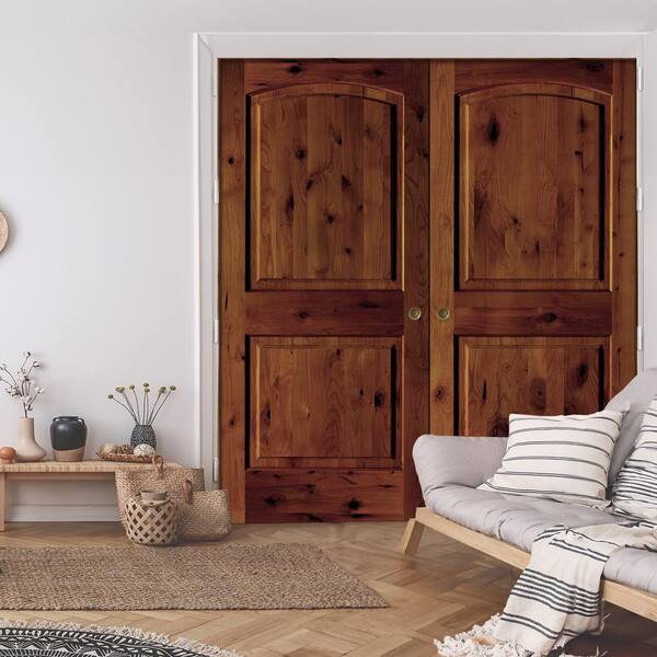 48 in. x 80 in. Rustic Knotty Alder 2-Panel Universal/Reversible Red Chestnut Stain Wood Double Prehung Interior Door