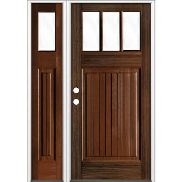 50 in. x 80 in. Craftsman 3-Lite Clear Glass VG Red Mahogany Stain Right Hand Hemlock Wood Prehung Front Door w/LSL