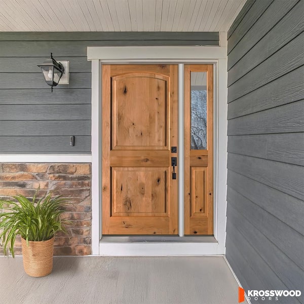 50 in. x 80 in. Knotty Alder 2-Panel Arch-Top Left-Hand/Inswing Clear Glass Cedar Stain Wood Prehung Front Door RHSL