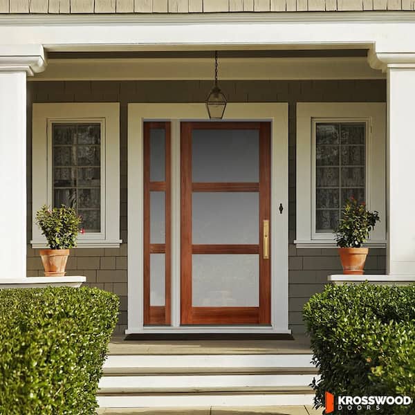 50 in. x 80 in. Modern Hemlock 3-Lite Left-Hand/Inswing Satin Glass Red Chestnut Stain Wood Prehung Front Door