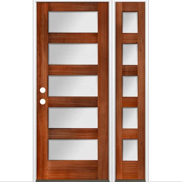 50 in. x 80 in. Modern Hemlock 5-Lite Right-Hand/Inswing Frosted Glass Red Chestnut Stain Wood Prehung Front Door w/RSL