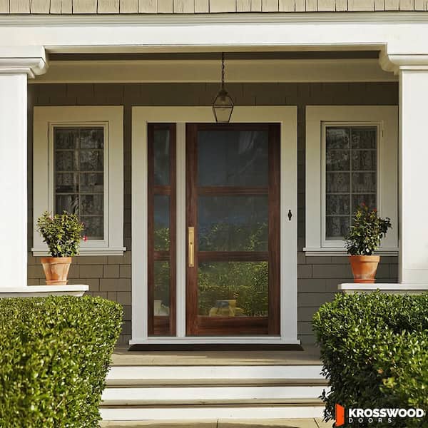 50 in. x 80 in. Modern Hemlock Right-Hand/Inswing 3-Lite Clear Glass Red Mahogany Stain Wood Prehung Front Door with LSL