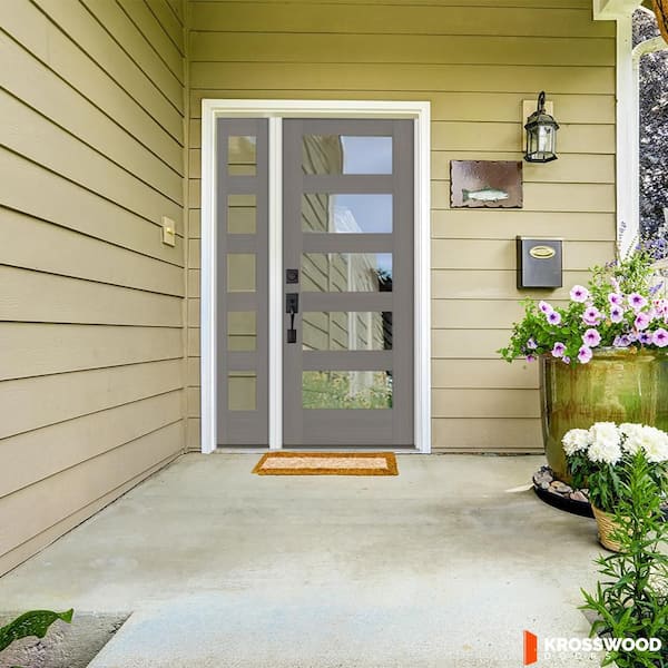 50 in. x 80 in. Modern Hemlock Right-Hand/Inswing 5-Lite Clear Glass Grey Stain Wood Prehung Front Door w/Left Sidelite