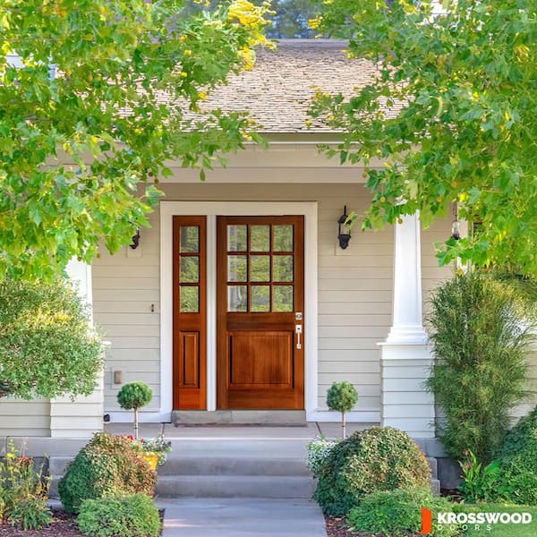 50 in. x 96 in. Farmhouse 9-Lite Clear Glass Left-Hand Red Chestntut Stain Hemlock Wood Prehung Front Door w/ LSL