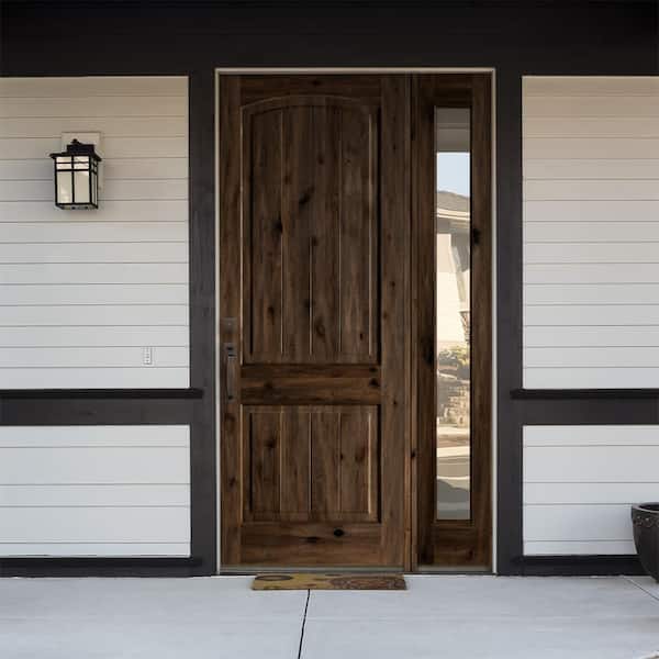 50 in. x 96 in. Rustic knotty alder Right-Hand/Inswing Clear Glass Provincial Stain Wood Prehung Front Door with RFSL
