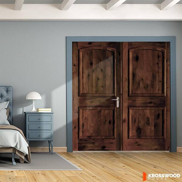 56 in. x 80 in. Rustic 2-Panel Arch Top Left Active Red Mahogany Stain Knotty Alder Wood Double Prehung Interior Door