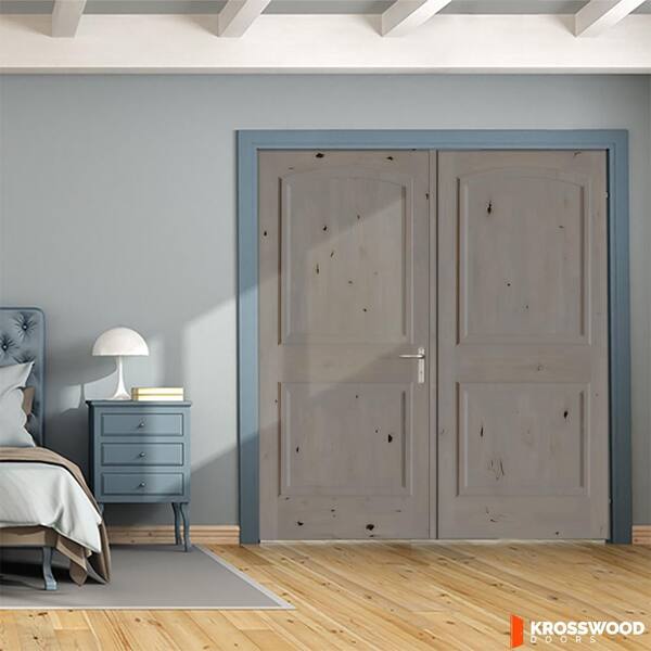 56 in. x 80 in. Rustic 2-Panel Arch Top Left Active Weathered Gray Stain Knotty Alder Wood Double Prehung Interior Door
