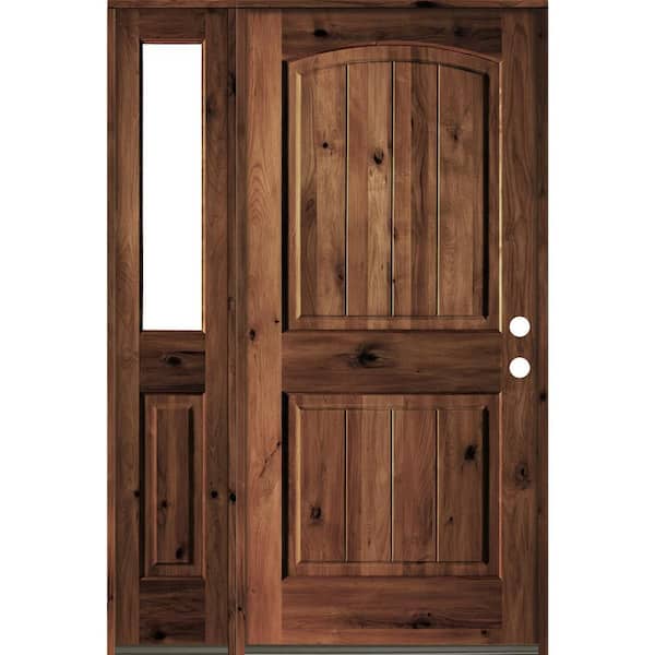 56 in. x 80 in. Rustic knotty alder Left-Hand/Inswing Clear Glass Red Mahogany Stain Wood Prehung Front Door w/Sidelite