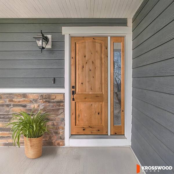 56 in. x 96 in. Knotty Alder 2-Panel Arch Right-Hand/Inswing Clear Glass cedar Stain Wood Prehung Front Door w/RFSL