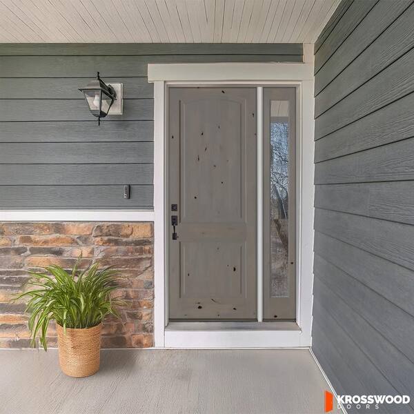 56 in. x 96 in. KnottyAlder 2Panel Arch Right-Hand/Inswing Clear Glass weathered gray Stain Wood Prehung Front Door RFSL