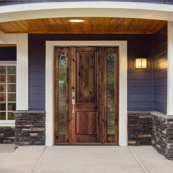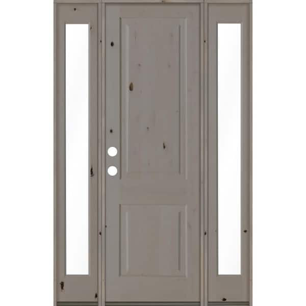 58 in. x 96 in. Rustic Knotty Alder Right-Hand/Inswing Clear Glass Grey Stain Square Top Wood Prehung Front Door