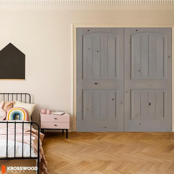 60 in. x 80 in. Knotty Alder 2-Panel Arch Top VG Both Active Weathered Gray Stain Wood Double Prehung Interior Door