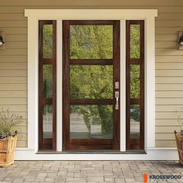 60 in. x 80 in. Modern Hemlock Left-Hand/Inswing 3-Lite Clear Glass Red Mahogany Stain Wood Prehung Front Door with DSL