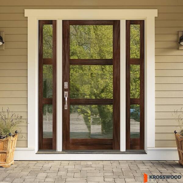 60 in. x 80 in. Modern Hemlock Right-Hand/Inswing 3-Lite Clear Glass Red Mahogany Stain Wood Prehung Front Door with DSL
