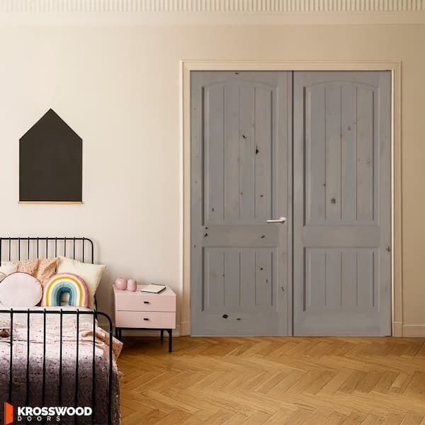 60 in. x 96 in. Knotty Alder 2-Panel Arch Top VG Left Hand Weathered Gray Stain Wood Double Prehung Interior Door