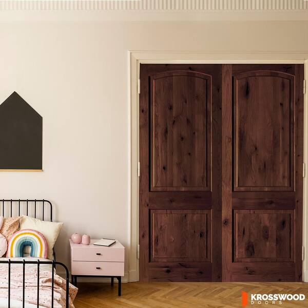 60 in. x 96 in. Rustic 2-Panel Arch Top Universal Red Mahogany Stain Knotty Alder Wood Double Prehung Interior Door