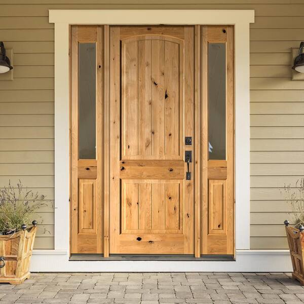 60 in. x 96 in. Rustic Alder Arch Provincial Stained Wood with V-Groove Left Hand Single Prehung Front Door