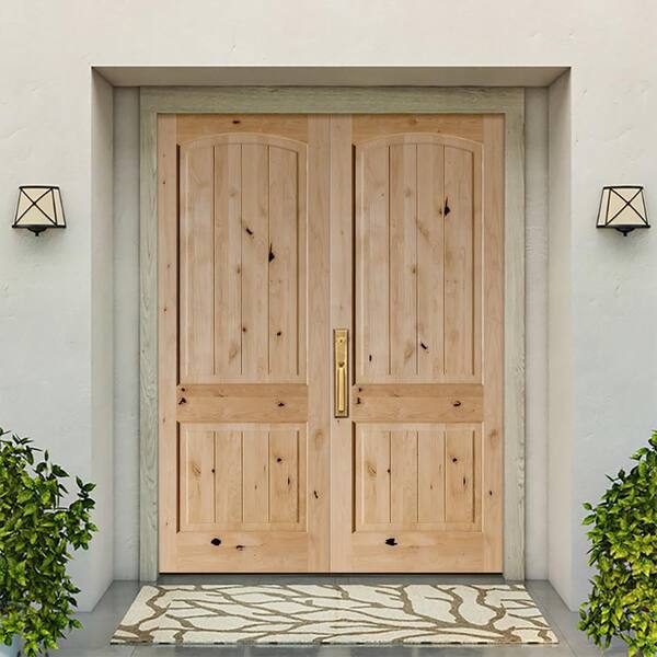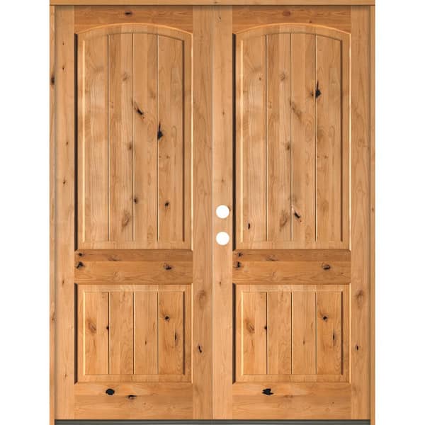 60 in. x 96 in. Rustic Knotty Alder Arch Top Clear Stain /V-Groove Right-Hand Inswing Wood Double Prehung Front Door