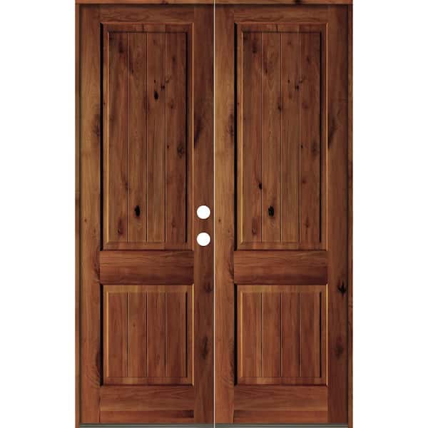 60 in. x 96 in. Rustic Knotty Alder Square Top Red Chestnut Stain/V-Groove Left-Hand Wood Double Prehung Front Door