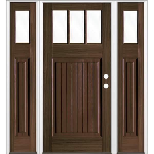 64 in. x 80 in. Craftsman 3-Lite Clear Glass VG Black Stain Left Hand Hemlock Wood Prehung Front Door w/DSL