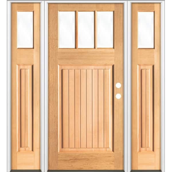 64 in. x 80 in. Craftsman 3-Lite Clear Glass VG Clear Stain Left Hand Hemlock Wood Prehung Front Door w/DSL