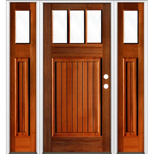 64 in. x 80 in. Craftsman 3-Lite Clear Glass VG Red Chestnut Stain Left Hand Hemlock Wood Prehung Front Door w/DSL