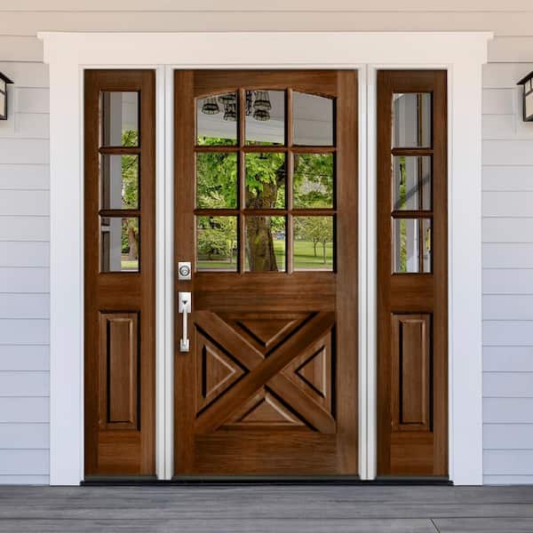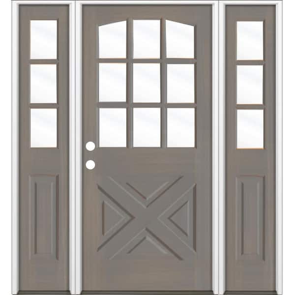 64 in. x 80 in. Farmhouse X Panel RH 1/2 Lite Clear Glass Grey Stain Hemlock Prehung Front Door with DSL