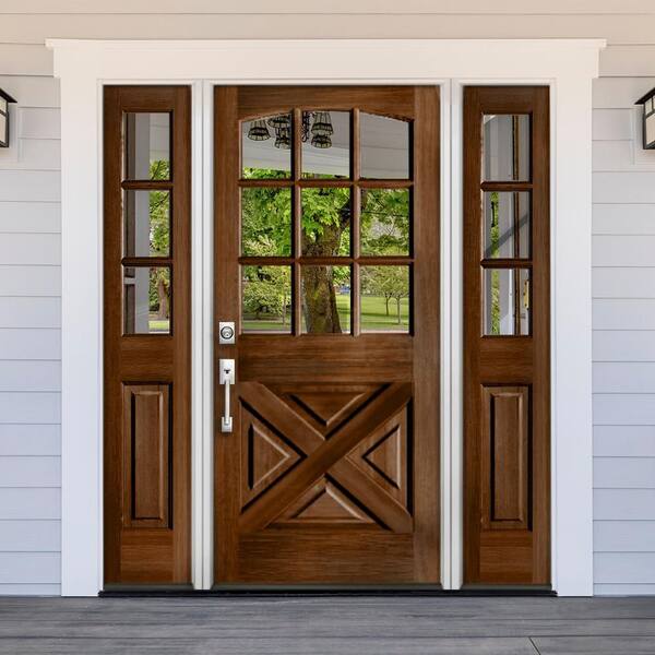 64 in. x 80 in. Farmhouse X Panel RH 1/2 Lite Clear Glass Red Mahogany Stain Hemlock Prehung Front Door with DSL