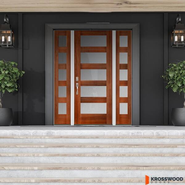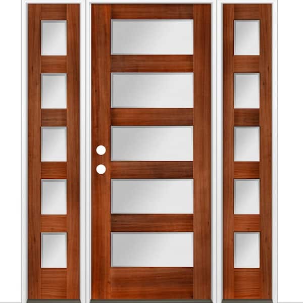 64 in. x 80 in. Modern Hemlock 5-Lite Right-Hand/Inswing Frosted Glass Red Chestnut Stain Wood Prehung Front Door w/DSL