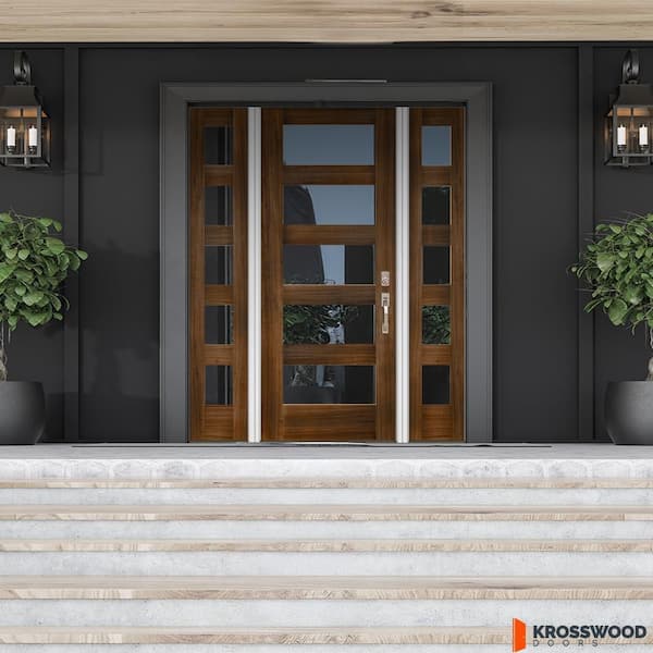 64 in. x 80 in. Modern Hemlock Left-Hand/Inswing Clear Glass Provincial Stain Wood Prehung Front Door with Sidelites